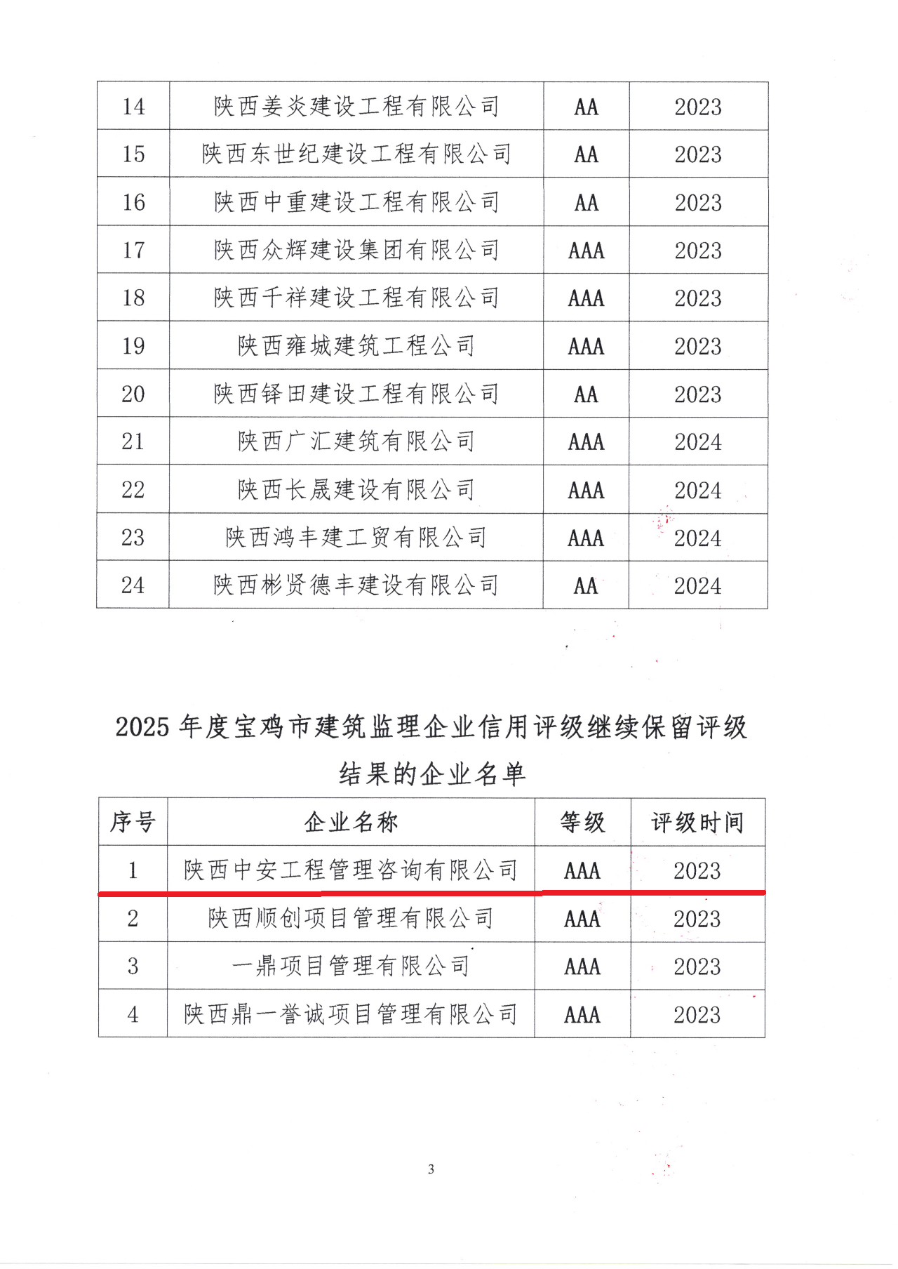 公司继续保持宝鸡市建筑监理企业信用等级aaa级 | |