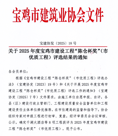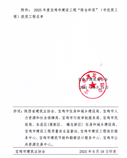 8月19日,宝鸡市建筑业协会发布了《关于2025年度宝鸡市建设工程“陈仓杯奖”(市优质工程)评选结果的通知》,我公司监理的千阳县宝平路片区老旧小区改造小区外配套基础设施建设项目、千阳县2015年公共租赁住房配套道路工程等11个项目(打捆)施工标段两项目获此殊荣。